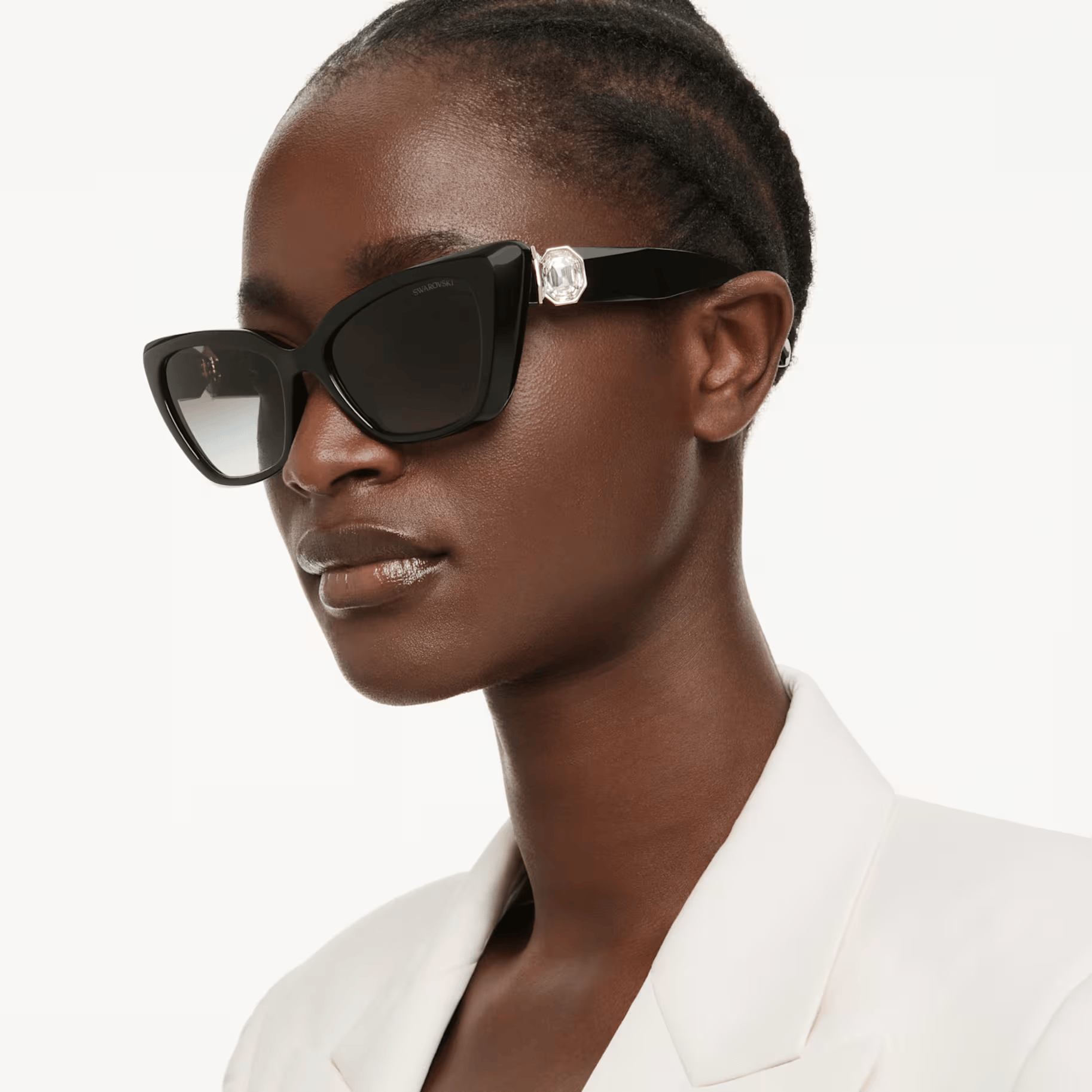 Эти выразительные солнцезащитные очки сочетают в себе инновации и фирменный стиль Swarovski. Вдохновленные культовой ювелирной коллекцией Millenia, блестящие черные оправы имеют эксклюзивный шарнир с каждой стороны, украшенный двумя прозрачными восьмиугольными кристаллами. Темно-серые линзы выполнены в эффектной форме «кошачий глаз», создавая ультрасовременный гламурный образ.