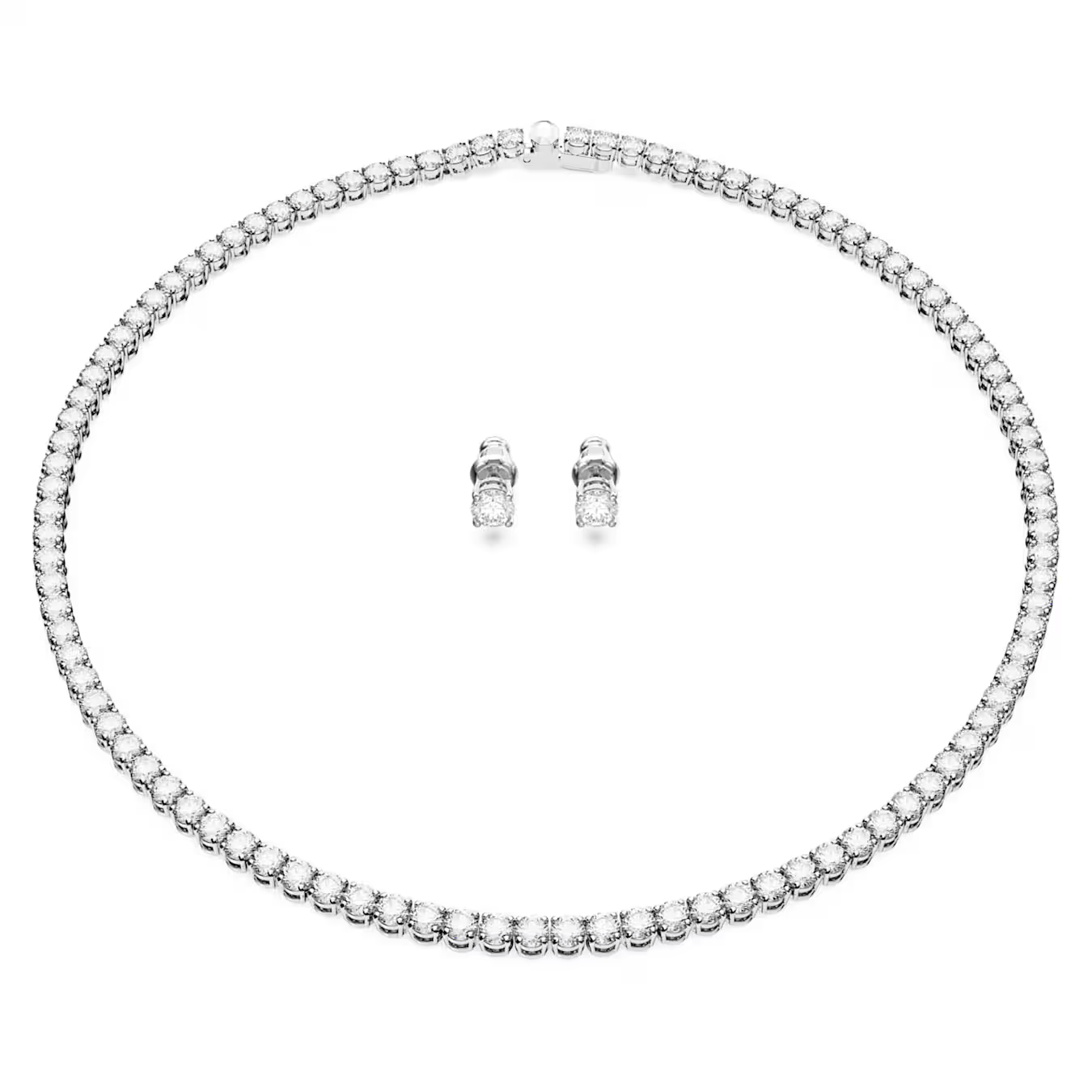 Этот идеально подобранный комплект гарантирует, что ваш образ будет выражен в полной гармонии. Он включает в себя колье с нитью сверкающих прозрачных камней и изысканной застежкой, а также пару нежных сережек-гвоздиков. Для повседневного образа или просто для создания красивого акцента на вечернем выходе это беспроигрышный вариант.